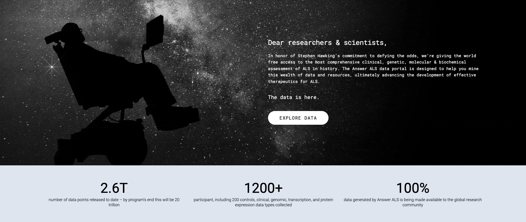 On January 8, 2021, which would have been Stephen Hawking’s 79th birthday, we launched a data portal to catch the attention of ALS researchers. To drive them to our data portal, we created an empathic social film and displayed ads celebrating his life’s accomplishments, positioning the data portal as a gift in his honor. In the first few months, the campaign achieved over 79M impressions, beating an original objective of just 7.4M.